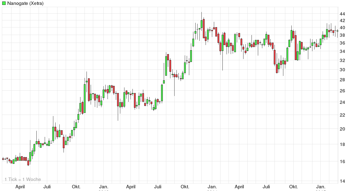 Anders sieht es bei Nanogate aus. Hier wachsen die Umsätze Jahr für Jahr. Im Jahr 2014 konnte die Firma die Umsatz- und Ergebnisprognose übertreffen. Nach vorläufigen Zahlen stieg der Umsatz um rund 27 % auf mehr als 67 Mio. Euro. Das EBITDA stieg um über 15 Prozent auf 7,2 Mio. Euro. Auch 2015 sollen die Umsätze weiter steigen. Mittelfristig will Nanogate die Umsatzmarke von 100 Mio. Euro übertreffen und die Profitabilität steigern. Damit dürfte auch die Aktie mittelfristig weiter Potenzial haben.