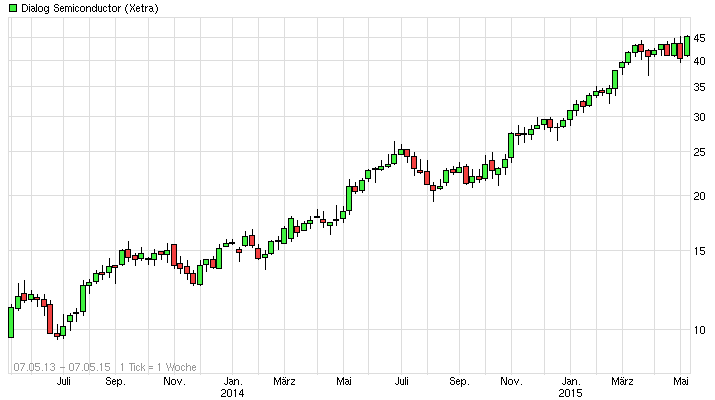 Dank des Smartphone-Booms kletterte der Umsatz des Halbleiterherstellers im ersten Quartal um satte 41 Prozent auf 311,2 Millionen US-Dollar. Der Gewinn legte um 25 Prozent auf 38,8 Millionen US-Dollar zu. Damit übertraf Dialog die Erwartungen der Analysten und setzt seinen Erfolgskurs fort. Investoren sind begeistert und reißen sich um die TecDAX-Aktie. Der Titel überwindet heute sogar die 45 Euro Marke und markiert ein neues Jahreshoch.