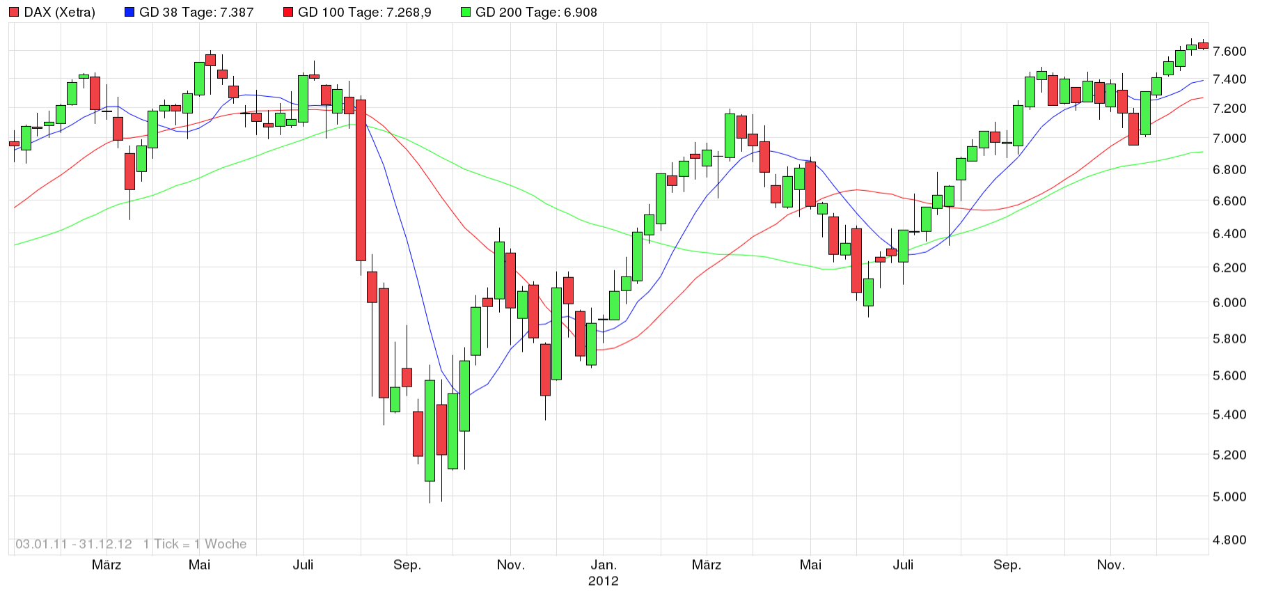 Im Jahr 2011 war dies anders. Damals fiel der DAX von 7.200 Punkten auf 5.000 Zähler innerhalb von sechs Wochen. Der Aktienindex durchbrach ebenfalls alle drei wichtigen Tage-Linien. Aber im Jahr 2012 konnte der Index die 200-Tage-Linie wieder überwinden und ab Juli gab es ein schönes Einstiegssignal. Die 200-Tage-Linie zeigte wieder eine steigende Tendenz.
