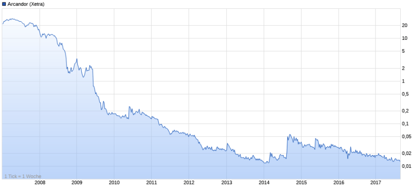 Bestes Beispiel für den Kursverlauf einer Pleite-Aktie ist Arcandor: Vor acht Jahren ging der Handelskonzern mit seinen Töchtern Karstadt und Quelle in die Insolvenz. Die Aktie notiert noch immer an der Börse. Sie kostet heute 0,01 Euro.
