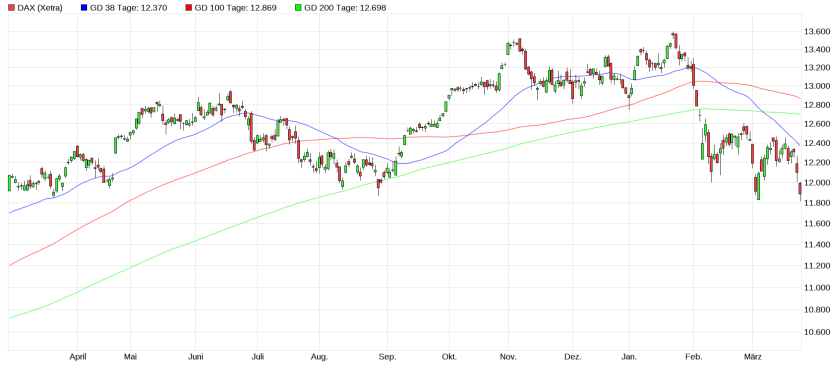 Der deutsche Aktienindex schloss am Freitag unter der Marke von 12.000 Punkten. Aber von Kursturz oder Talfahrt, wie in vielen Börsenberichten dramatisiert wird, kann keine Rede sein. Die Marke von 11.800 Zählern hat vorerst gehalten. Dieser Unterstützungsbereich ist aus charttechnischer Sicht sehr wichtig; das Tief von Anfang März sollten Anleger daher im Blick behalten. Wird diese Marke unterschritten, drohen weitere Kursverluste.