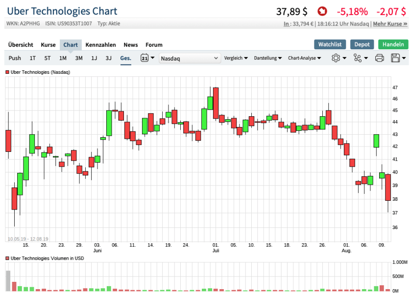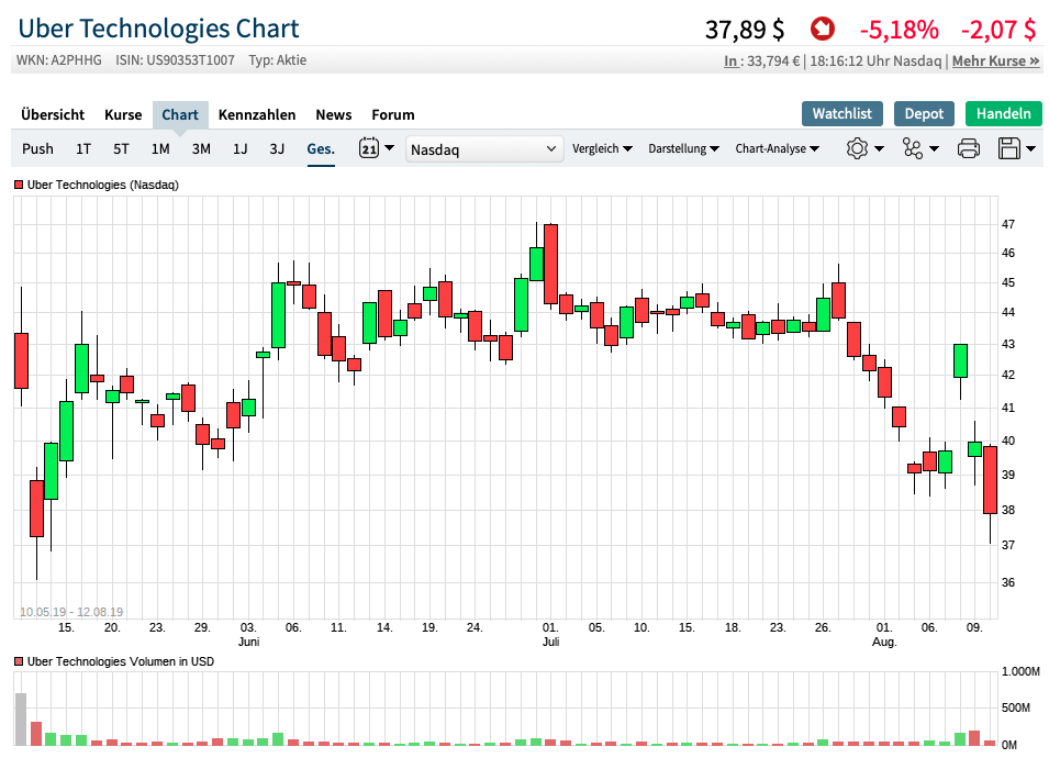 Und im zweiten Quartal 2019 – die Zahlen gab das Unternehmen Ende der vergangenen Woche bekannt – fiel bedingt durch den milliardenschweren Börsengang sogar ein Verlust von 5,2 Milliarden Dollar an. Analysten hatten mit einem Verlust in dieser Größenordnung gerechnet. Aber der Umsatz im zweiten Quartal stieg nur um 14 Prozent auf 3,2 Milliarden Dollar. Und im Kerngeschäft mit Fahrdiensten wuchs Uber im Jahresvergleich lediglich um zwei Prozent auf rund 2,4 Milliarden Dollar. Ein schwacher Wert – und die Folge an der Börse war eindeutig. Nach Bekanntgabe der Zahlen rutschte die Aktie tief ins Minus. Der Chart sieht derzeit angeschlagen aus.