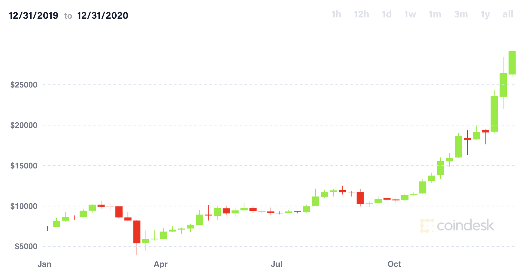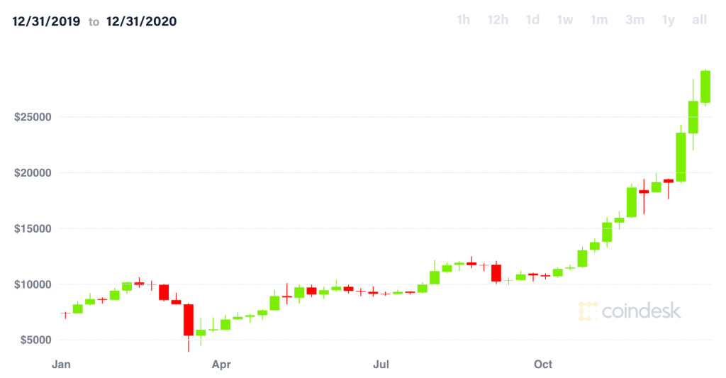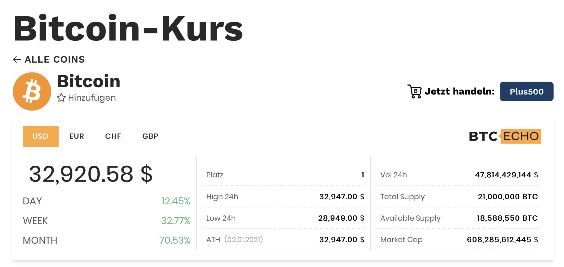 Hier der Jahreschart des Bitcoin, der heute die Marke von 30.000 US-Dollar überschritten hat und aktuell bei fast 33.000 Dollar notiert.